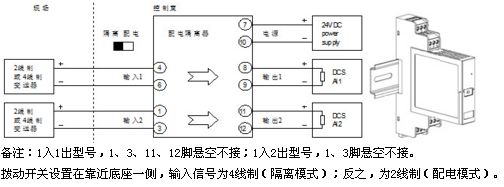 MIK-502E系列信號隔離器兼容配電(無源輸入)和隔離(有源輸入)2種模式:配電(無源輸入)模式,向現(xiàn)場的2線制變送器提供工作電源,采樣變送器輸出的2線制電流信號,經(jīng)過隔離處理后轉(zhuǎn)換為4線制電流信號輸出;隔離(有源輸入)模式,采樣4線制電流信號,經(jīng)過隔離輸出4線制電流信號。通過產(chǎn)品上側(cè)內(nèi)置的撥動開關(guān)可設(shè)置輸入模式??蛇x1入1出、1入2出、2入2出。