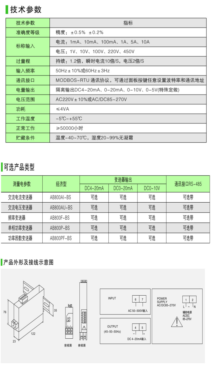 規(guī)格:輸入AC0-100V 輸出DC4-20mA 或DC0-5V
