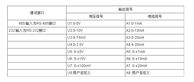 選型舉例2: 型號:WJ31-232-U1 表示RS-232接口,0-5V信號輸出