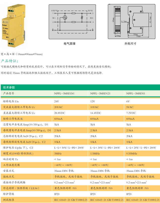 NPFL-3MSD51,NPFL-3MSD121,NPFL-3MSD241,二線制通用型信號(hào)浪涌保護(hù)器(浮地)