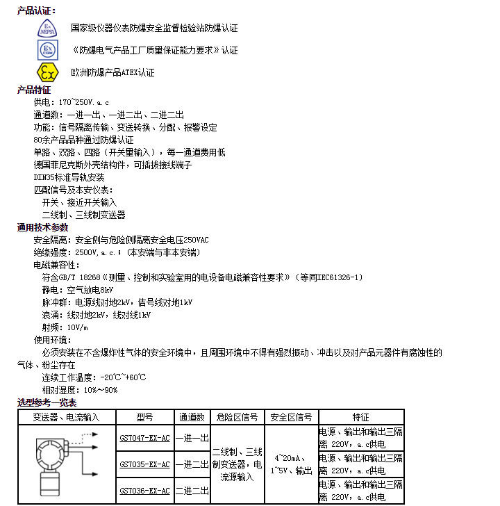 GS7047-EX-AC,GS7035-EX-AC,GS7036-EX-AC,交流供電隔離柵