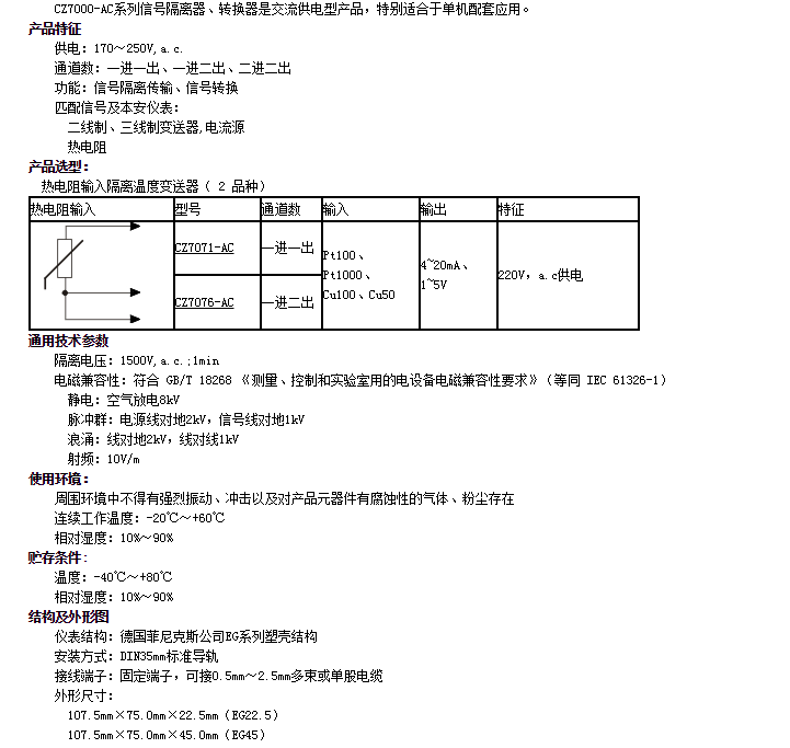 CZ7071-AC,CZ7076-AC,隔離溫度變送器