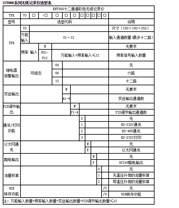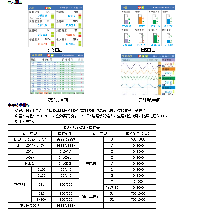 KH7000系列12路萬能輸入彩屏無紙記錄儀,可輸入標(biāo)準(zhǔn)電流、標(biāo)準(zhǔn)電壓、頻率、毫伏、熱電偶、熱電阻等信號。具有傳感器隔離配電輸出、繼電器報警輸出、變送輸出、流量積算、溫壓補(bǔ)償、歷史數(shù)據(jù)轉(zhuǎn)存、打印以及遠(yuǎn)程通訊功能。