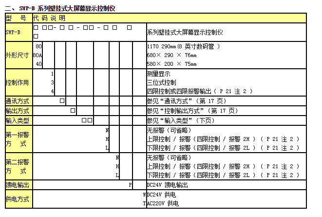 SWP-B 壁掛式大屏幕顯示控制儀采用微處理器進(jìn)行控制運(yùn)算,可對各種非線性輸入信號進(jìn)行精度極高的線性矯正測量,顯示屏采用高度亮、大尺寸 LED 數(shù)碼管。 SWP-B 壁掛式大屏幕顯示控制儀,適用于大車間,遠(yuǎn)距離觀測場所,可對溫度、壓力、液位、速度、頻率等測量信號進(jìn)行數(shù)字測量顯 示控制,使測量值更為清晰。
