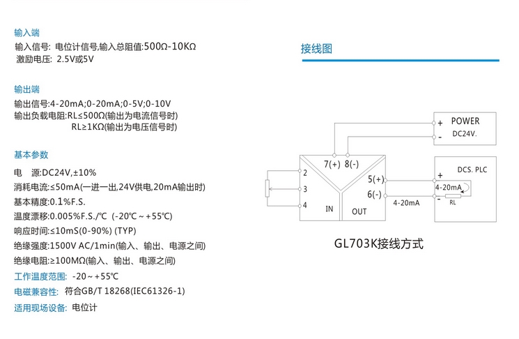 GL703K信號隔離調(diào)理器輸入范圍:0-500Ω 0-1KΩ、0-10KΩ、0-20KΩ等用戶特定規(guī)格