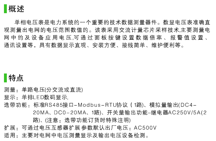 PD204U-9K1智能單相電壓表采用交流采樣技術(shù)真有效值測量,能同時測量顯示電網(wǎng)中的單相電壓0到450V,可通過面板按鍵設(shè)置編程及 倍率,性價比極高。具有安裝方便、接線簡單、維護便利、工程量小、現(xiàn)場可編程設(shè)置輸入?yún)?shù)等特點,可擴展帶485通訊協(xié)議