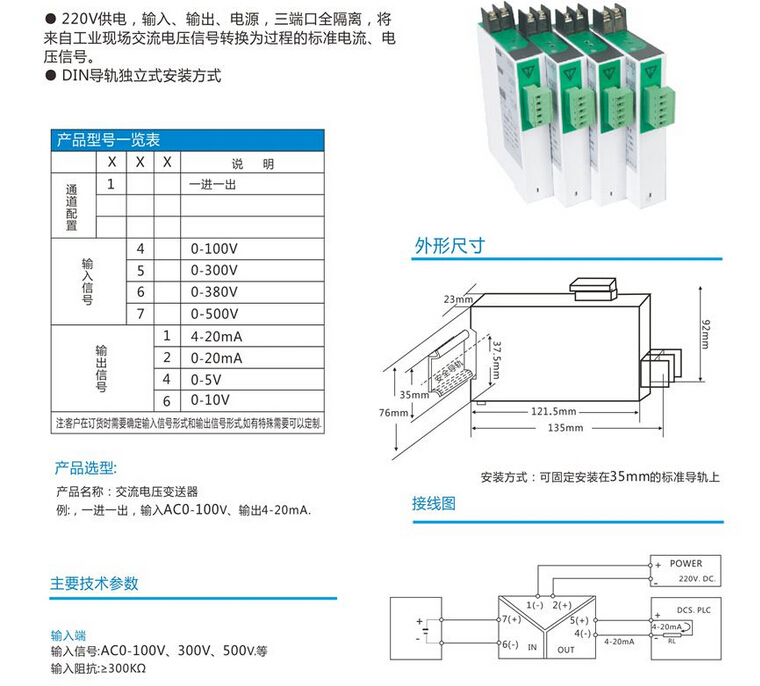 電壓變送器輸入范圍:AC0-100V、0-300V、0-500V等用戶特定規(guī)格