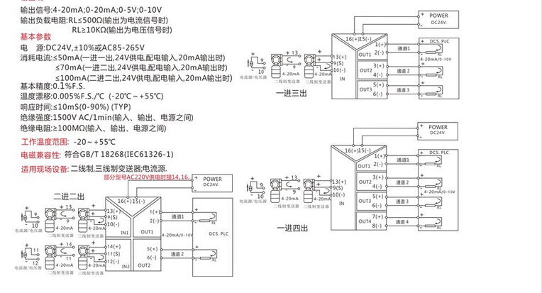 信號隔離器 分配器 輸入輸出方式:一進一出、一進二出、一入三出、一入四出、二入二出