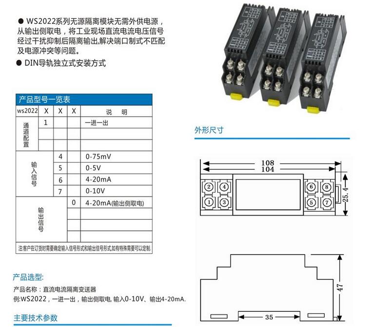 WS2022系列無源隔離模塊,無需外供電源,從輸出側(cè)取電,將工業(yè)現(xiàn)場(chǎng)的直流電流電壓信號(hào),經(jīng)過干擾抑制后隔離輸出,解決端口制式不匹配及電源沖突等問題,DIN導(dǎo)軌式安裝。