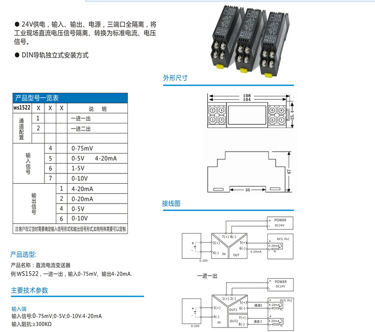 WS1522信號隔離器,直流電流變送器詳細(xì)技術(shù)參數(shù)及接線方式