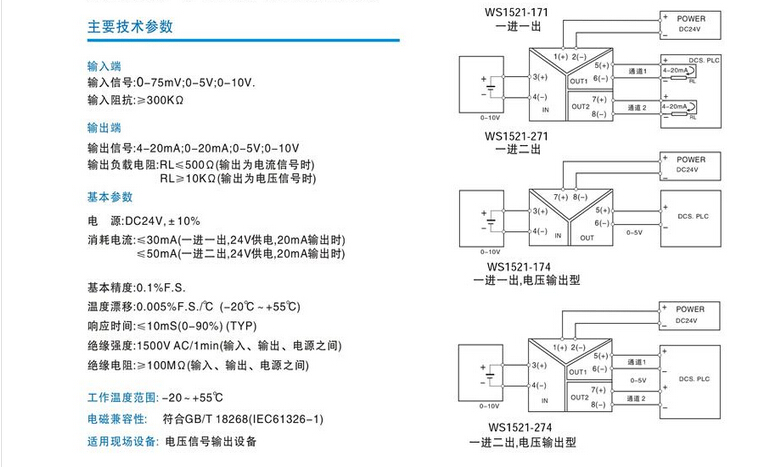 WS1521信號(hào)隔離器 輸出范圍:0-5V、0-10V、0-20mA、4-20mA、1-5V等用戶(hù)需求的輸出信號(hào)