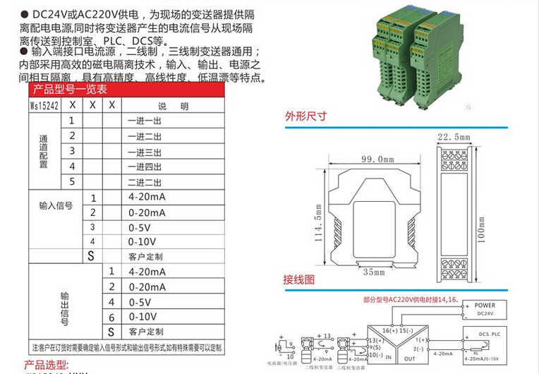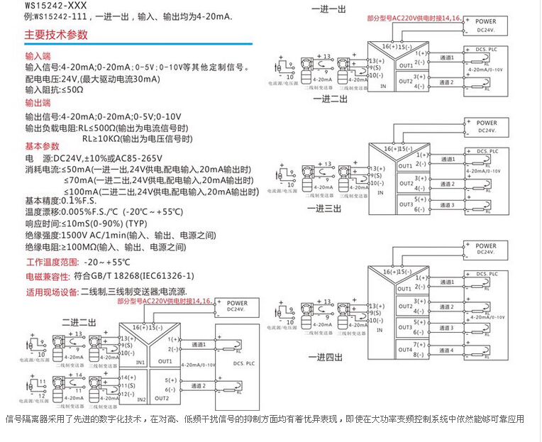 WS15242全隔離雙輸出信號(hào)分配器,將輸入信號(hào)變換為兩路相互隔離的信號(hào),低功耗,低熱量,低漂移,DIN T型導(dǎo)軌安裝