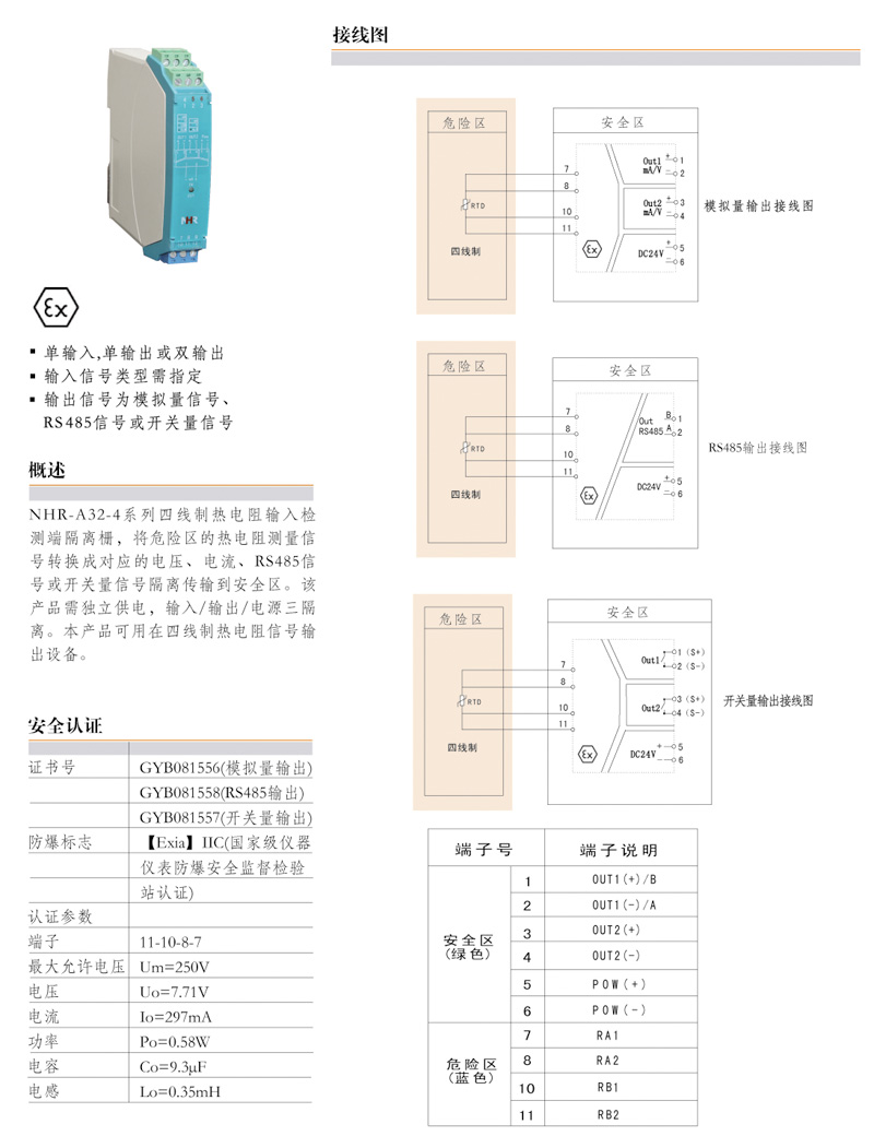 NHR-A32-4四線制熱電阻輸入檢測端隔離柵,將危險(xiǎn)區(qū)的熱電阻測量信號轉(zhuǎn)換成對應(yīng)的電壓、電流、RS485信號或開關(guān)量信號隔離傳輸?shù)桨踩珔^(qū)。該產(chǎn)品需獨(dú)立供電,輸入/輸出/電源三隔離。本產(chǎn)品可用在四線制熱電阻信號輸出設(shè)備。