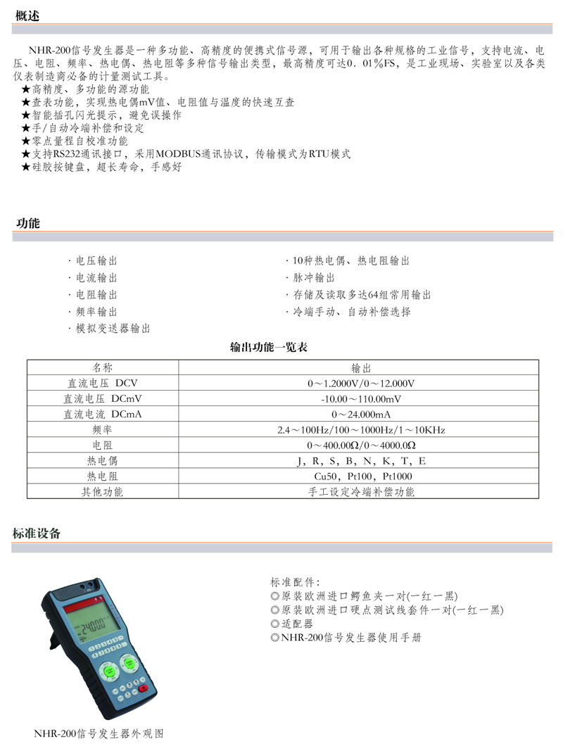 NHR-200信號發(fā)生器是一種多功能、高精度的便攜式信號源,可用于輸出各種規(guī)格的工業(yè)信號,支持電流、電壓、電阻、頻率、熱電偶、熱電阻等多種信號輸出類型,最高精度可達0.01%F.S,是工業(yè)現(xiàn)場、實驗室以及各類儀表制造商必備的計量測試工具。