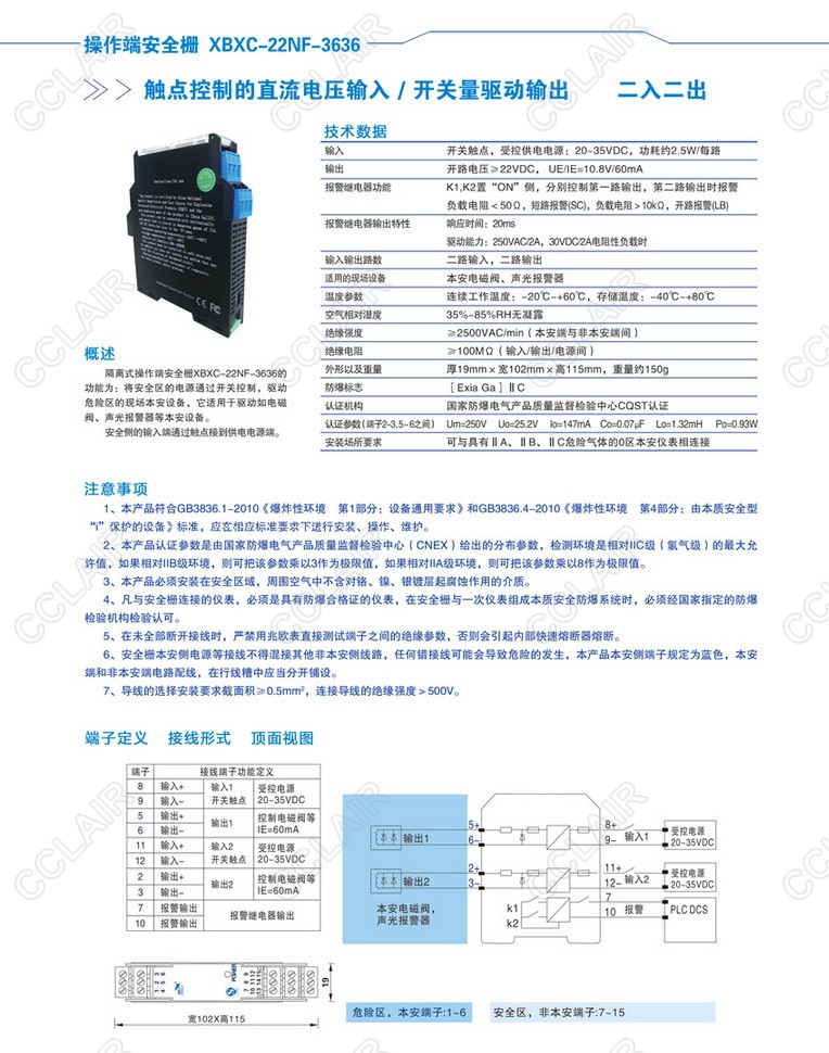 XBXC-22NF-3636,操作端安全柵開關(guān)量驅(qū)動輸出(二入二出)