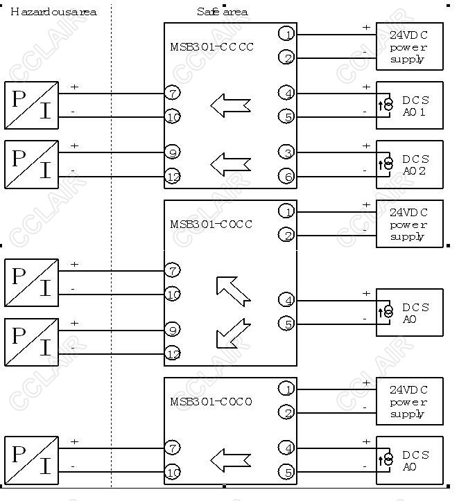 接收安全場所的線性電壓/電流信號,經(jīng)過隔離處理后輸出給危險