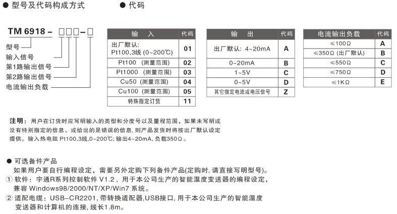 是智能型的熱電阻溫度變送器, 有 USB 編程接口, 可以使用專用的編程電纜連接這個溫度變送器和PC機, 通過軟件在PC機上進行編程, 可以任意編程設定熱電阻分度號和測量溫度的量程范圍。