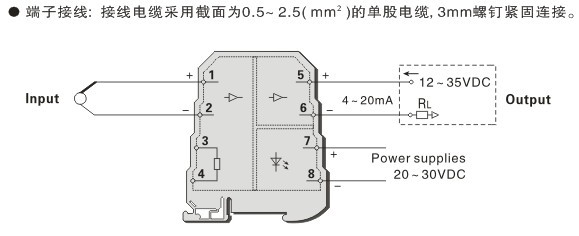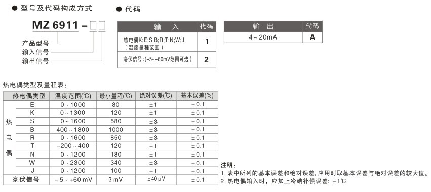 用于 K、E、S、B 等型熱電偶輸入,經(jīng)隔離變送輸出標準的直流電流信號4~20mA。