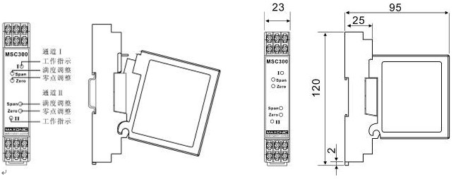 訂貨須知 訂貨時(shí)需寫(xiě)明上述型號(hào)及代碼,同時(shí)有輸入輸出信號(hào)及溫度范圍 例1:輸入Pt100,0~500℃,輸出1~5VDC,一入一出,則型號(hào)為MSC304-1030,0~500℃ 例2:輸入Pt100,0~800℃,輸出1為1~5VDC,輸出2為1~5VDC,一入二出,則型號(hào)為MSC304-1033,0~800℃ MSC304 熱電阻溫度變送器 拆裝圖 外形尺寸圖 (95mm×23mm×120mm)
