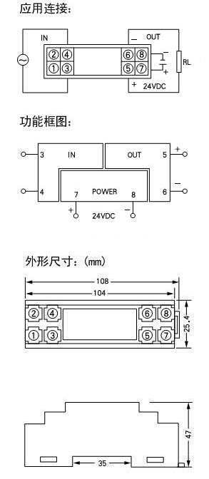 將5A交流信號變換為工業(yè)儀表標(biāo)準(zhǔn)信號;輸入、輸出與24VDC電源三者間相互隔離;DIN T型標(biāo)準(zhǔn)卡裝方式。 |