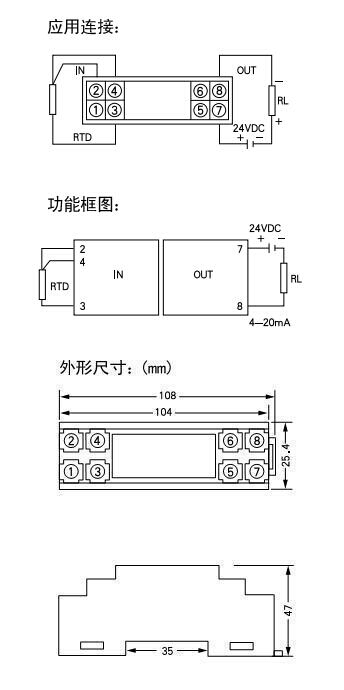 二線制4-20mA輸出;可直接與Pt熱電阻傳感器接口;內(nèi)含線性化和長線補償功能;DIN T型導軌卡裝方式。