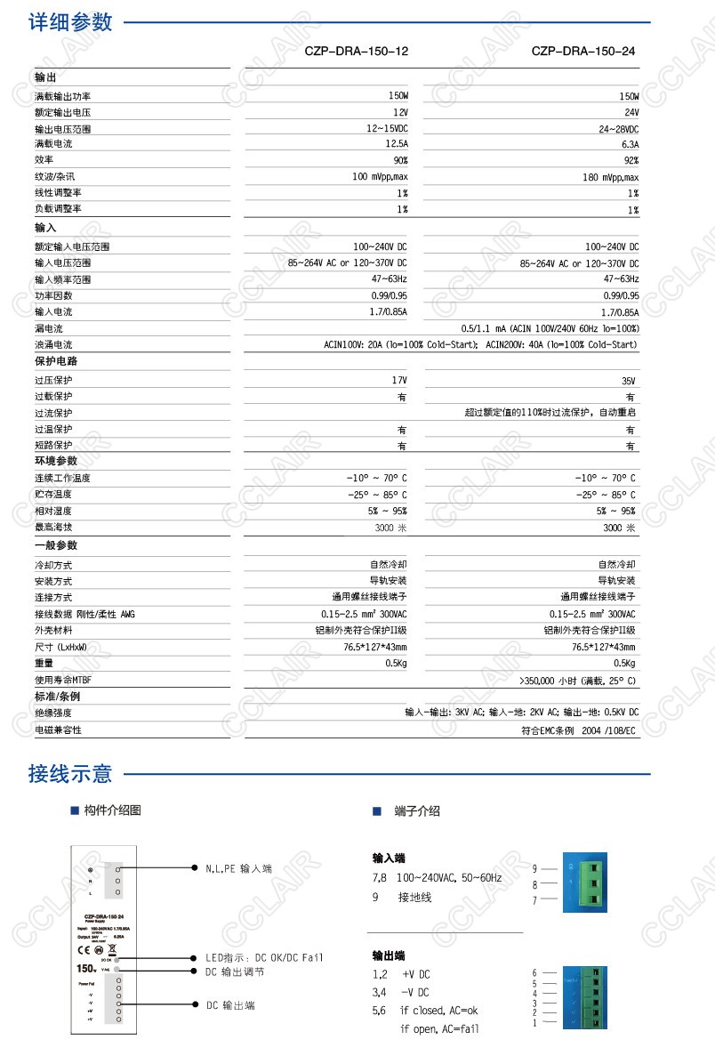 CZP-DRA-150-24 導(dǎo)軌型開(kāi)關(guān)電源150W/24V輸出