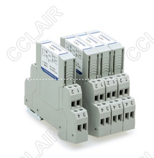 24V信號SPD,三線制,適用于線對地隔離電壓>500V信號回路,最大放電電流Imax(8/20us):20kA/線,12.5mm超薄,通過DIN35金屬導軌接地。