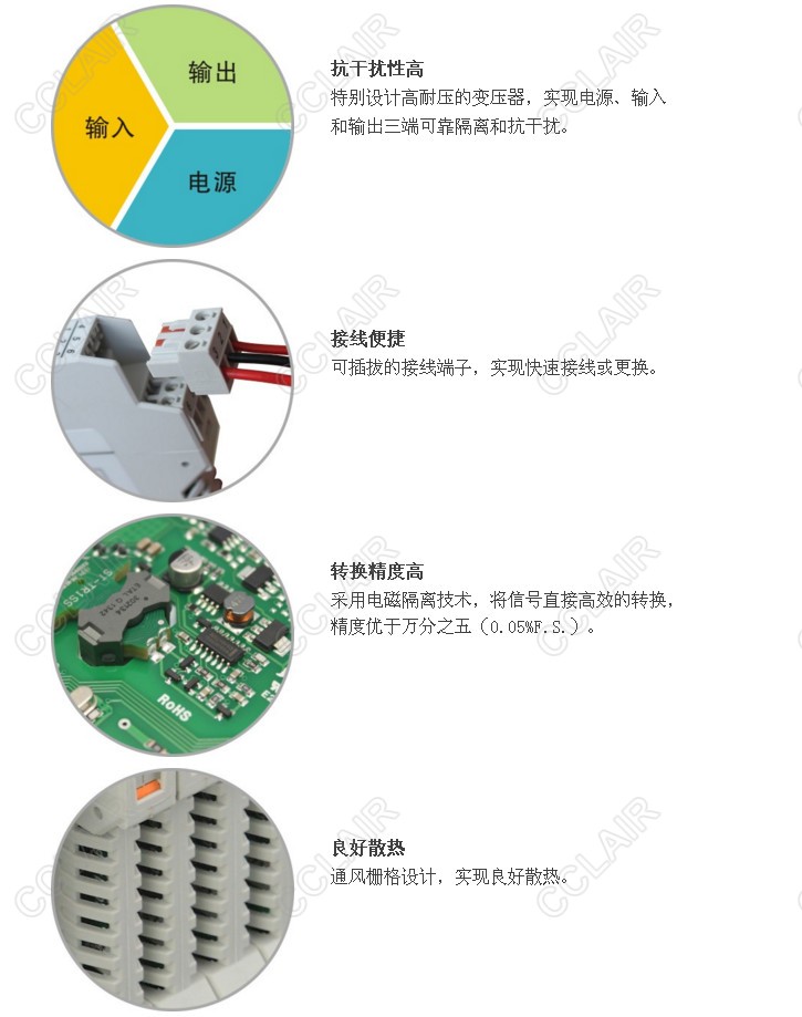 二線制、三線制變送器、電流源、電壓源輸入隔離信號分配器,可為變送器提供隔離電源,將變送 器 產(chǎn)生的0/4~20mA信號(也可以是電流源信號或0/1~5V、0/2~10V電壓信號)轉(zhuǎn)換成0/4~20mA電流信號或0/1~5V、0/2~10V電壓信號輸出。該產(chǎn)品需要獨(dú)立供電,電源、輸入和輸出三隔離,各輸出通道之間亦隔離。