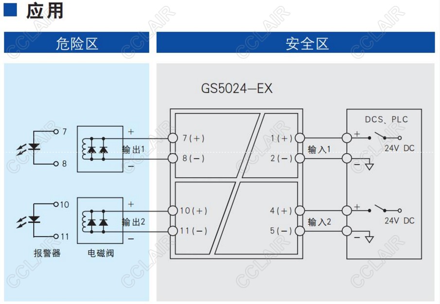開關量輸出隔離式安全柵,將安全區(qū)的電源通過開關控制,驅(qū)動危險區(qū)的現(xiàn)場本安設備,它適用于驅(qū)動如電磁閥、聲光報警器等一些小功率本安設備。它有二個獨立的通道。輸入輸出隔離,允許控制開關直接連到24VDC供電回路的任一端。