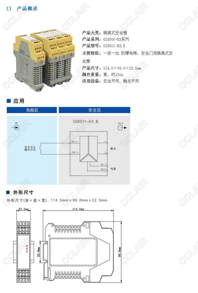 開關(guān)量輸入隔離式安全柵,接收來自危險區(qū)的安全開關(guān)或觸點開關(guān)輸入,通過安全柵隔離傳輸?shù)桨踩珔^(qū)輸出。輸入信號處理采用雙重冗余電路;通過通道間互相故障監(jiān)測和觸點粘結(jié)判斷停機功能。特別適用于防爆電梯、安全門等防爆設(shè)備的安全開關(guān)信號的監(jiān)控處理。