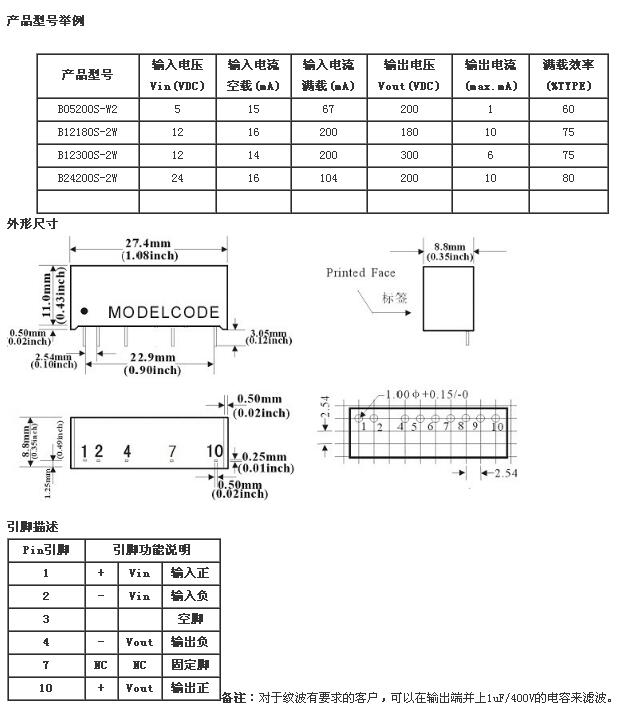 B05200S-W2,B12180S-2W,B12300S-2W,B24200S-2W,高壓電源模塊