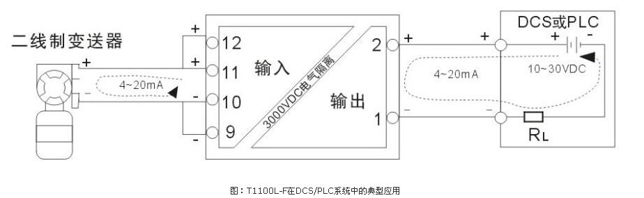 此模塊廣泛應(yīng)用在DCS和PLC系統(tǒng),在系統(tǒng)信號(hào)檢測(cè)回路中,通過(guò)金升陽(yáng)隔離變送器模塊T1100L-F模塊既能通過(guò)對(duì)輸出側(cè)取電(即輸出回路供電)供模塊正常工作,無(wú)需外接電源,有效地解決對(duì)供電電源的依賴(lài),滿足二線制回路供電的要求,又能有效地濾除信號(hào)中的干擾噪聲,實(shí)現(xiàn)系統(tǒng)狀態(tài)精準(zhǔn)檢測(cè),保證系統(tǒng)可靠穩(wěn)定運(yùn)行,安裝方便,可節(jié)省大量電纜和安裝維護(hù)成本,具體典型應(yīng)用方案如下圖所示: