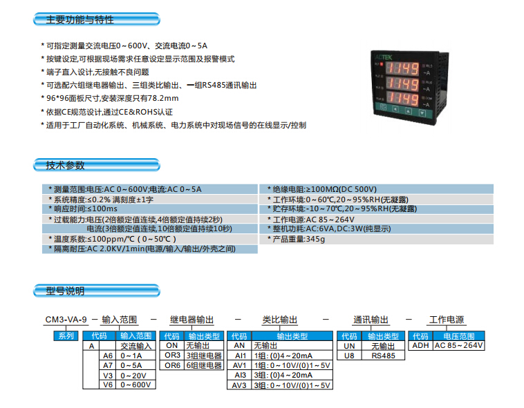 CM3-VA9,CM3-VA9-A,CM3-VA9-A6,CM3-VA9-A7,CM3-VA9-V3,智能三相電壓/電流表