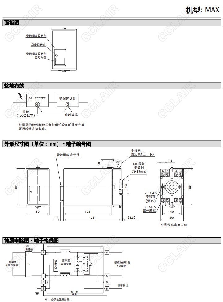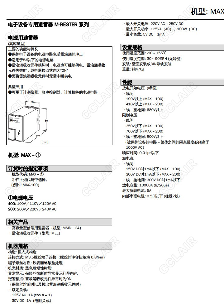MAX-100/MAX-200, 最大負載5A 可更換元件避雷器