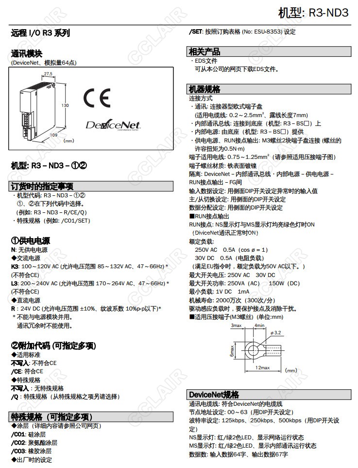R3-ND3,R3-ND3-R/CE/Q,R3-ND3-N,R3-ND3-K3,DeviceNet 模擬量信號(hào) 64點(diǎn)通訊模塊R3-ND3-L3,R3-ND2-R,