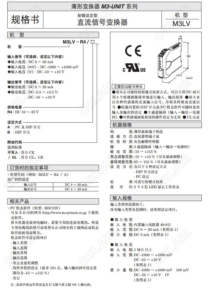 M3LV,M3LV-R4/A,M3LV-R4/B,M3LV-R4/A/UL,M3LV-R4/B/UL,直流信號變換器(按鍵設(shè)定型)