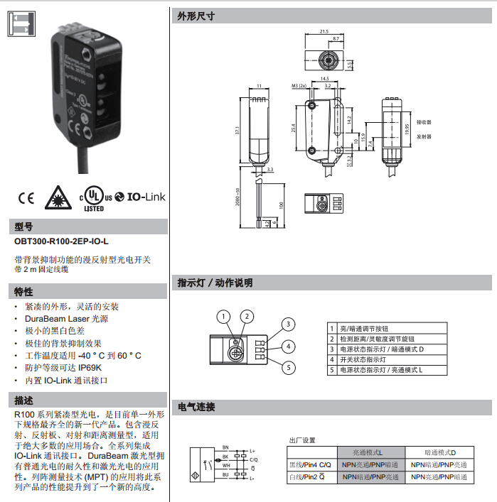 OBT300-R100-2EP-IO-L,漫反射型傳感器