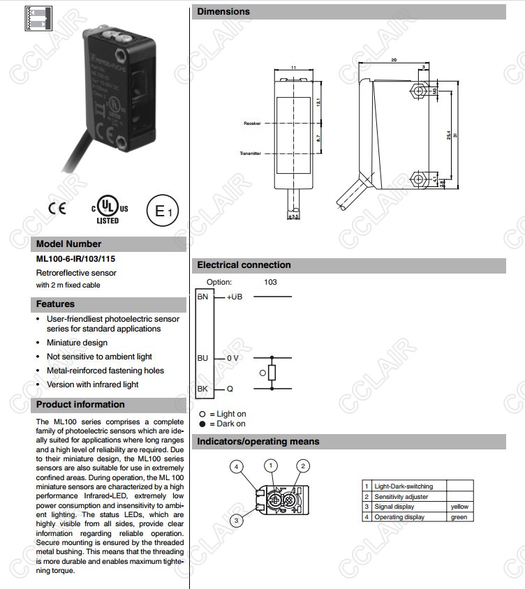 ML100-55-6086/102,ML100-6-IR/102/115,ML100-6-IR/103/115,反射板型傳感器