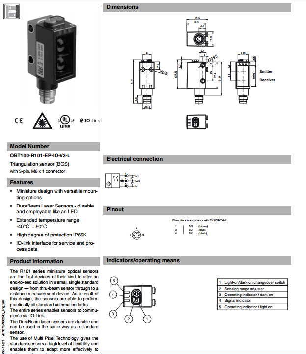 OBT100-R101-EP-IO-V3-L,漫反射型傳感器