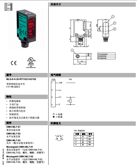 ML8-8-H-30-RT/103/143/162,漫反射型傳感器