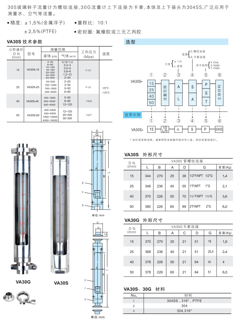 VA30G-15,VA30G-25,VA30G-40,VA30G-50,卡套連接玻璃轉(zhuǎn)子