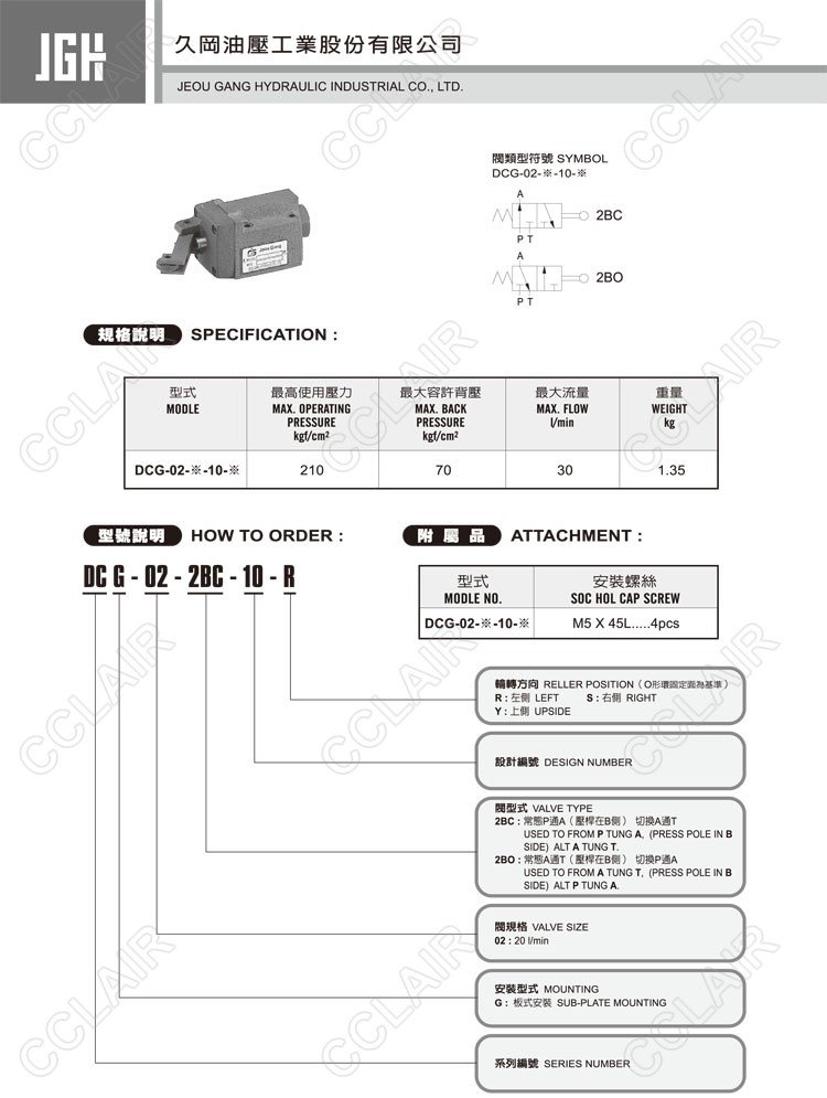 JeouGang臺灣久岡,凸輪行程換向閥DCG-02-2B2-20-R,DCG-02-2B2-20-S,DCG-02-2B2-20-Y,DCG-02-2B2S-20-R,DCG-02-2B2S-20-S,DCG-02-2B2S-20-Y