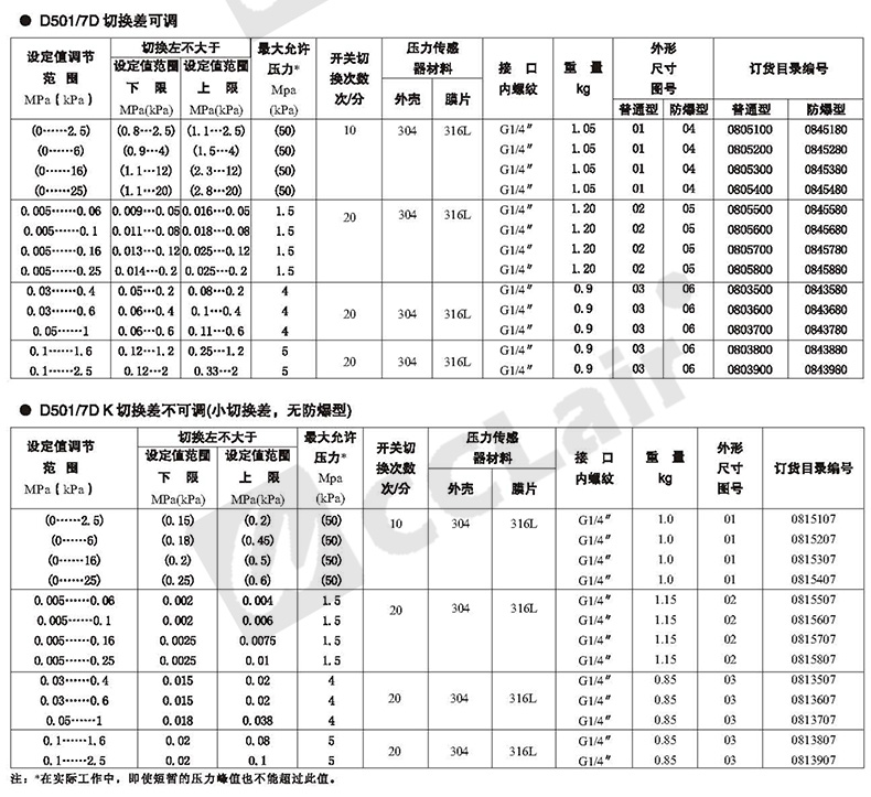 壓力控制器 D500/8D切換差不可調(diào)