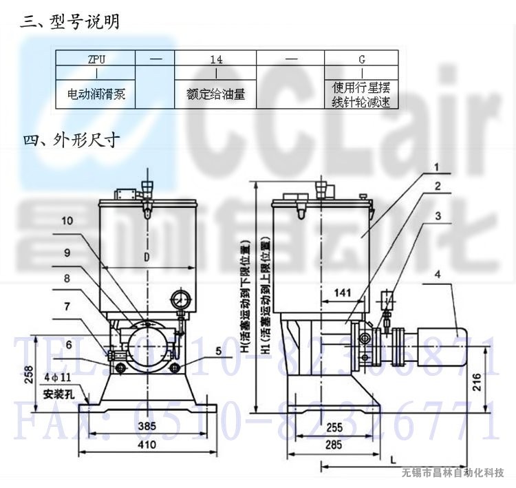 | 1、貯油筒;2、泵座;3、帶連結(jié)法蘭的柱塞泵裝置;4、減速電機(jī)5、加油口G3/4; 6、回油口G3/4;7、調(diào)壓安全閥;8、出油口G3/4;9、過濾器;10、單向閥 |