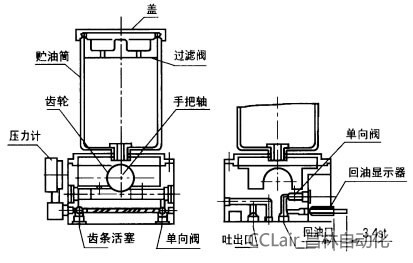| 手動潤滑泵是借人工擺動手把,通過齒輪帶動齒條活塞往復運動實現(xiàn)向外供油的,當活塞處于圖示極限位置時,潤滑脂通過吸入口吸入并充滿活塞的右腔,當活塞向右移動時,被吸入的潤滑脂在油壓的作用下頂開單向閥壓送至出口向外排出,當系統(tǒng)中主分配器的一計量油口返回至回油指示器的油量達到3.2mL時,指示桿全部伸出,證明系統(tǒng)所有潤滑點已得到所需的潤滑油量,此時停止操作手把并把指示桿向內(nèi)壓進,為下循環(huán)準備,指示器內(nèi)的潤滑脂經(jīng)單向閥返回貯油桶內(nèi)。 |