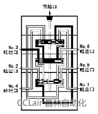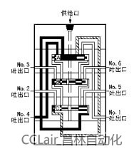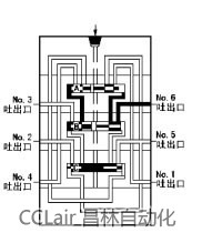 5、流入的潤滑劑推動活塞C向右移動、右腔的潤滑劑壓向NO.4吐出口經(jīng)外部配管送向潤滑點。當活塞C運動至右極限時活塞B左腔開始進入潤滑劑。