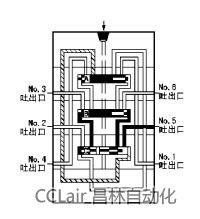 7、流入的潤滑劑推動活塞A 向右運動、右腔的潤滑劑壓向NO.6吐出口,經(jīng)外部配管送向潤滑點。當活塞A移動到至右極限時返回到初始1狀態(tài),繼續(xù)重復上述動作。