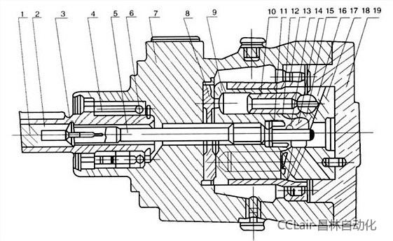 馬達(dá)外軸(3)同軸承(4)、(6)支承在殼體(7)上,內(nèi)軸(5)通過花鍵一端與外軸聯(lián)接,另一端與缸體(9)花鍵聯(lián)接,啟動(dòng)及空載時(shí)缸體在彈簧(2)和(11)作用下與配油盤(8)保持一定的油膜接觸,缸體另一端用軸承(13)支承在殼體上,缸體孔中有七個(gè)柱塞(10),柱塞的球形端部與滑靴(17)球窩包鎖,通常在工作時(shí)滑靴受油液壓力作用與斜盤(18)保持一定的油膜接觸,但當(dāng)自吸啟動(dòng)和轉(zhuǎn)速突然升高時(shí),油靴可能浮起,為了防止這種現(xiàn)象,在內(nèi)軸端部受彈簧(11)作用的球鉸(15)頂住回盤將滑靴壓在斜盤表面。