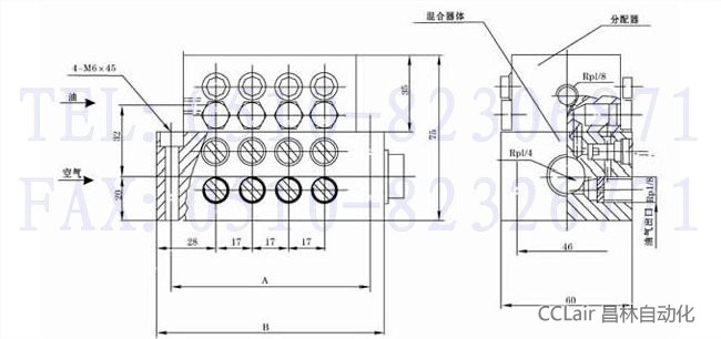 QHQ-J型油氣分配混合器,主要由中碳合金鋼制造的單線遞進式油分配器與由鋁合金材料制造的油氣混合器組合而成,設(shè)有一個進氣口,一個進油口,4~12個油氣出口。主要適用于單線二分式油氣潤滑系統(tǒng)或雙線-遞進式油氣潤滑系統(tǒng)中。