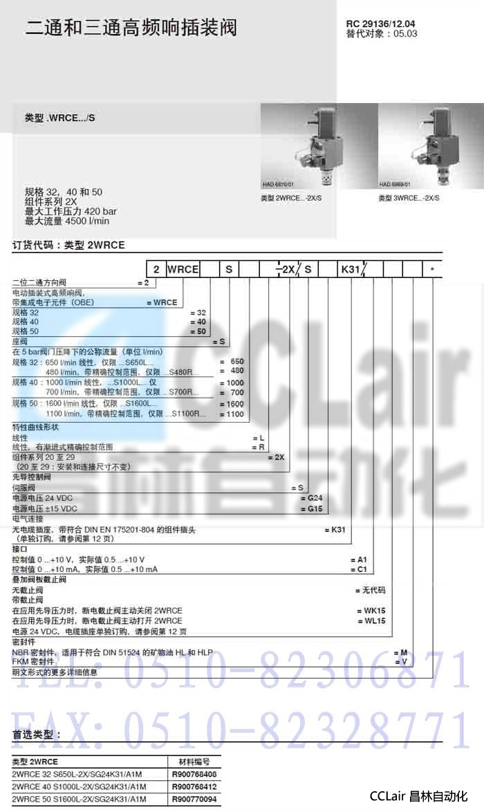 2WRCE32S650L-2X/SG24K31/A1M,2WRCE40S1000L-2X/SG24K31/A1M,二通和三通高頻響插裝閥,力士樂REXROTH,德國(guó)力士樂